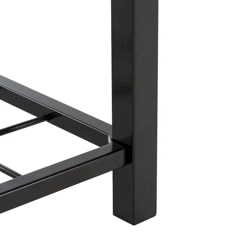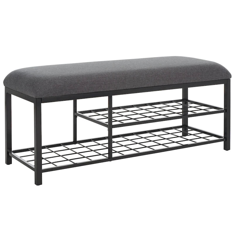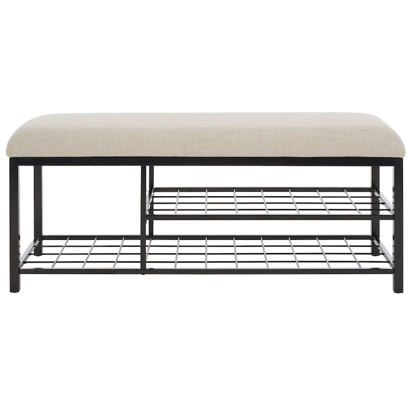 Embrace the dual functionality and sleek style of our open-shelf bench. A generously padded seat adds softness and comfort to our clean and minimal bench. It features a matte finish to effortlessly blend with a variety of aesthetics. Our bench delivers exceptional functionality with two tiers of metallic rack serving as a convenient spot to store your shoes and outdoor gear. Offering a comfy seat as you wear your shoes, our sleek bench remains a welcoming and versatile addition to an entryway or mudroom.