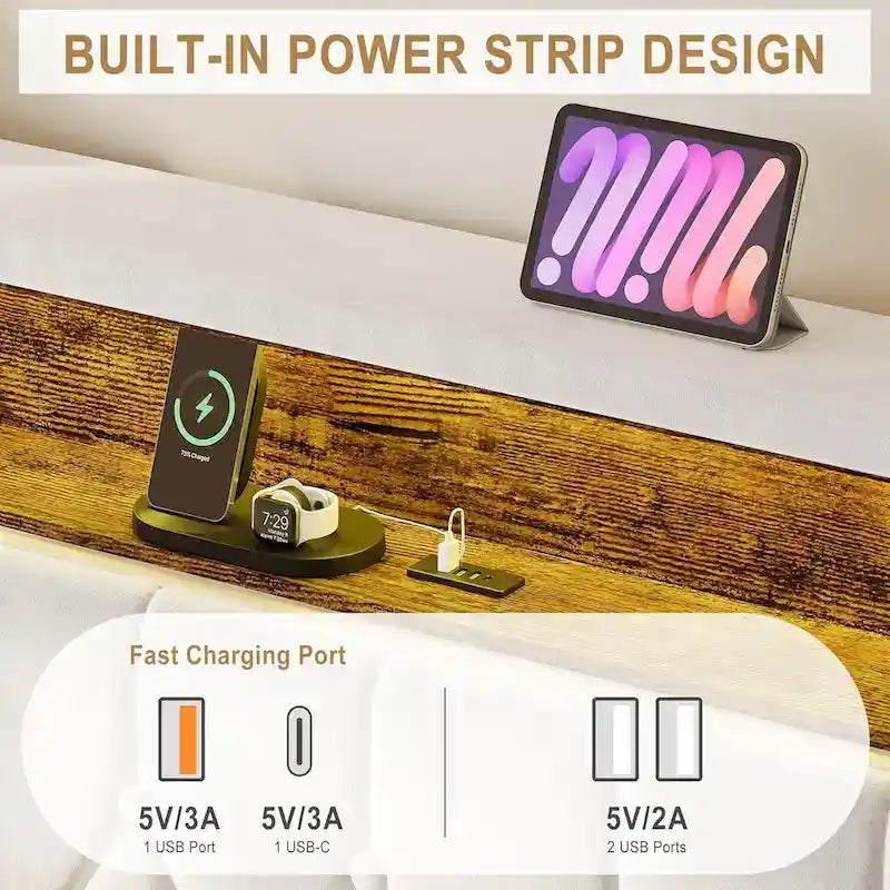 Immersive LED Lights: The bed frame is equipped with APP-controlled LED lights headboard, 12 scene modes, and 3 brightness, multiple RBG light color, The light color will flash with the beats of the music. You can freely set up the color, brightness, and mode to create different atmospheres.Multi-functional Storage Headboard: The bed frame with a charging station built into the headboard, 1 Type-C Port, and 3 USB Ports. Our bed frame with headboard features 2-tier storage shelves, providing you with enough space to store books, decorations, a clock, electronics, or some private stuff, which is convenient, and keeps your bedroom tidy.Elegant Upholstered Bed Frame: The nailhead trim and button-tufted headboard and footboard highlight the elegant design of this bed frame. The upholstered bed frame is made of high-quality velvet fabric, which is soft-touch, skin-friendly, and easy to clean, bringing you a comfortable experience.No Box Spring Needed: The bed frame with LED lights is crafted with a solid metal structure and solid wood slats can hold up to 800 lbs weight. 8-12 inches mattress is recommended.Easy Assembly & Noise Free: The bed frame with storage comes with all parts and detailed installation instructions, easy to assemble, saving you time. Our platform bed frame is equipped with EVA strips to reduce squeaks, ensuring a quiet sleeping environment.